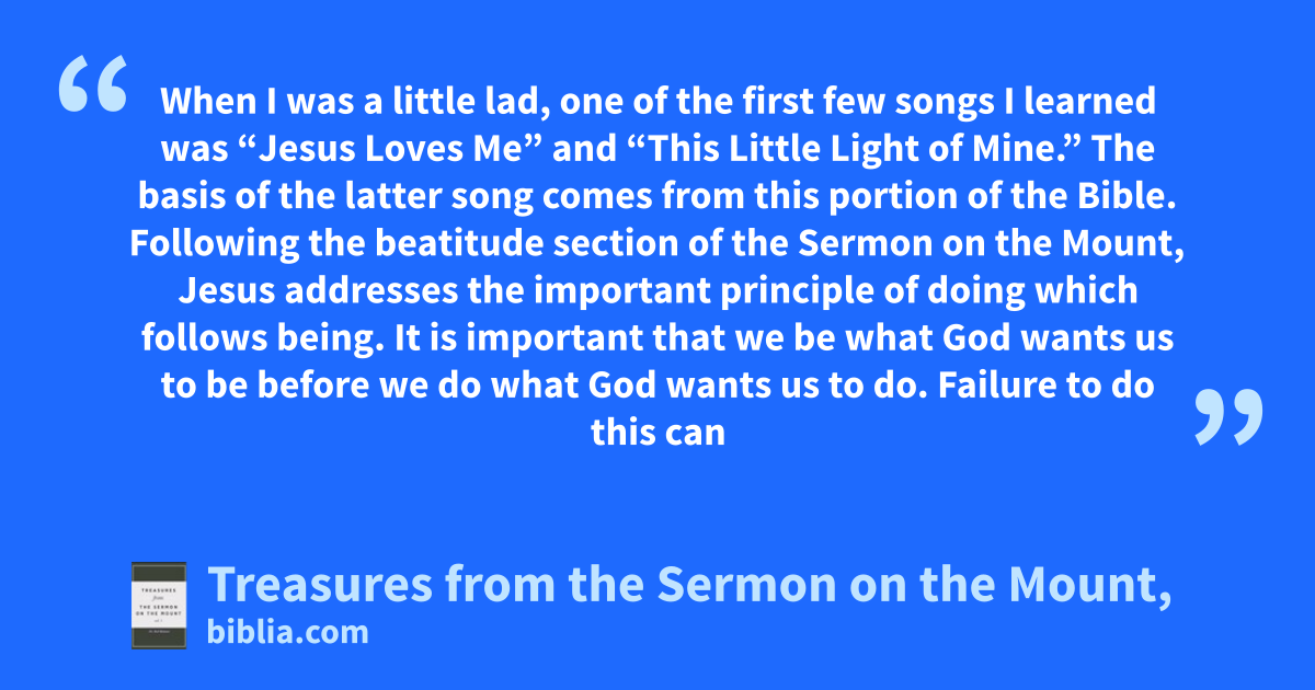 When I was a little lad, one of the first few songs I learned was “Jesus Loves Me” and “This Little Light of Mine.” The basis of the latter song comes from this portion of the Bible. Following the beatitude section of the Sermon on the Mount, Jesus addresses the important principle of doing which follows being. It is important that we be what God wants us to be before we do what God wants us to do. Failure to do this can
