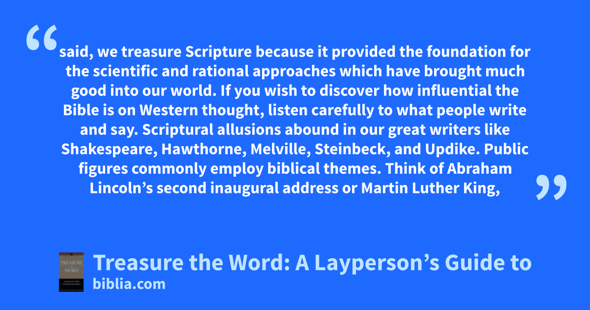said, we treasure Scripture because it provided the foundation for the scientific and rational approaches which have brought much good into our world. If you wish to discover how influential the Bible is on Western thought, listen carefully to what people write and say. Scriptural allusions abound in our great writers like Shakespeare, Hawthorne, Melville, Steinbeck, and Updike. Public figures commonly employ biblical themes. Think of Abraham Lincoln’s second inaugural address or Martin Luther King,