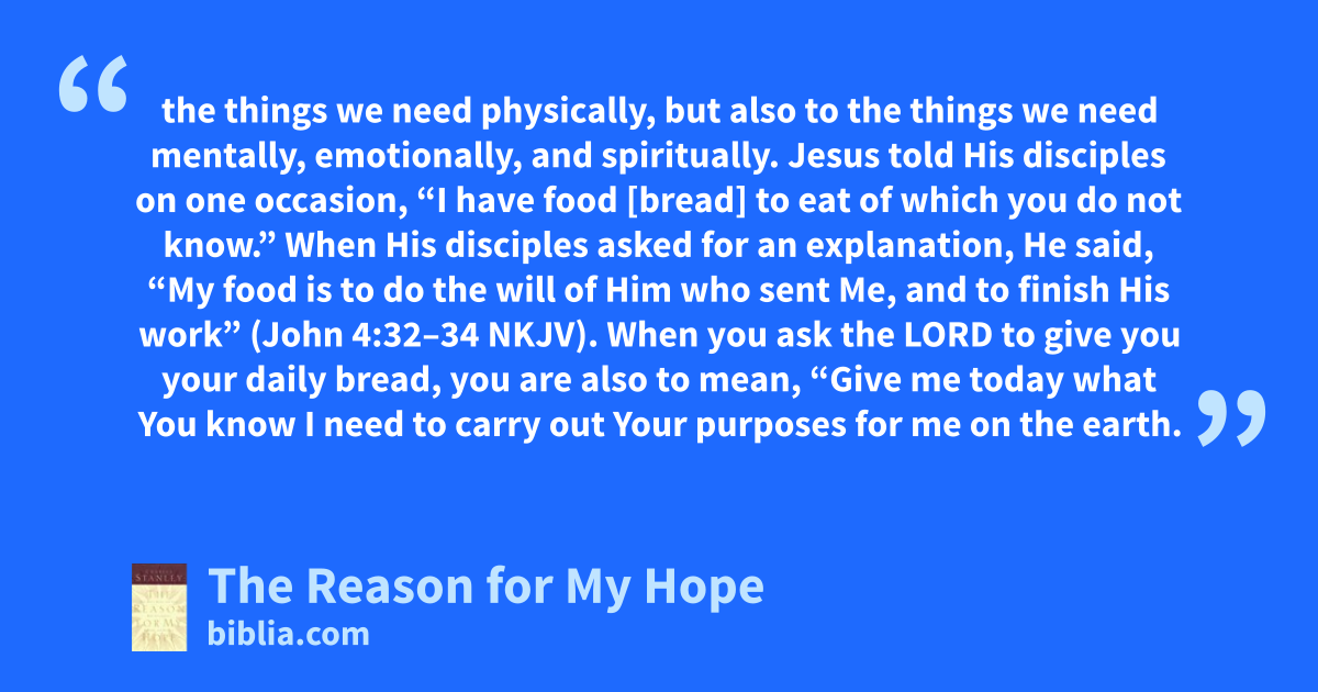 the things we need physically, but also to the things we need mentally, emotionally, and spiritually. Jesus told His disciples on one occasion, “I have food [bread] to eat of which you do not know.” When His disciples asked for an explanation, He said, “My food is to do the will of Him who sent Me, and to finish His work” (John 4:32–34 NKJV). When you ask the LORD to give you your daily bread, you are also to mean, “Give me today what You know I need to carry out Your purposes for me on the earth.
