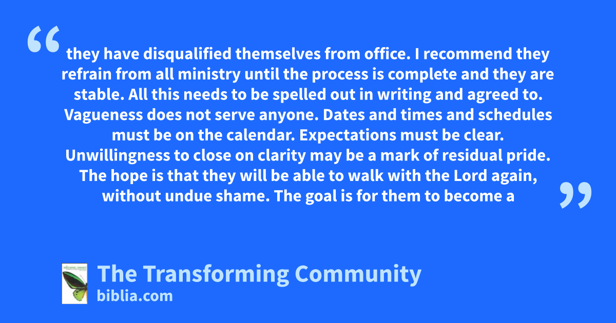 they have disqualified themselves from office. I recommend they refrain from all ministry until the process is complete and they are stable. All this needs to be spelled out in writing and agreed to. Vagueness does not serve anyone. Dates and times and schedules must be on the calendar. Expectations must be clear. Unwillingness to close on clarity may be a mark of residual pride. The hope is that they will be able to walk with the Lord again, without undue shame. The goal is for them to become a