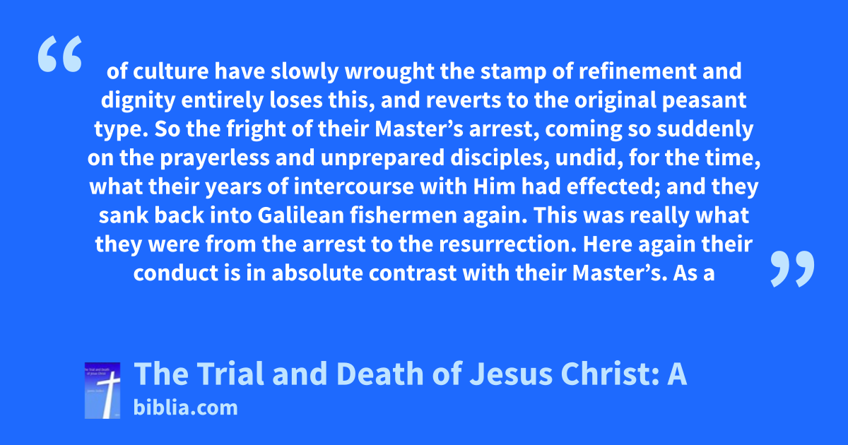 of culture have slowly wrought the stamp of refinement and dignity entirely loses this, and reverts to the original peasant type. So the fright of their Master’s arrest, coming so suddenly on the prayerless and unprepared disciples, undid, for the time, what their years of intercourse with Him had effected; and they sank back into Galilean fishermen again. This was really what they were from the arrest to the resurrection. Here again their conduct is in absolute contrast with their Master’s. As a