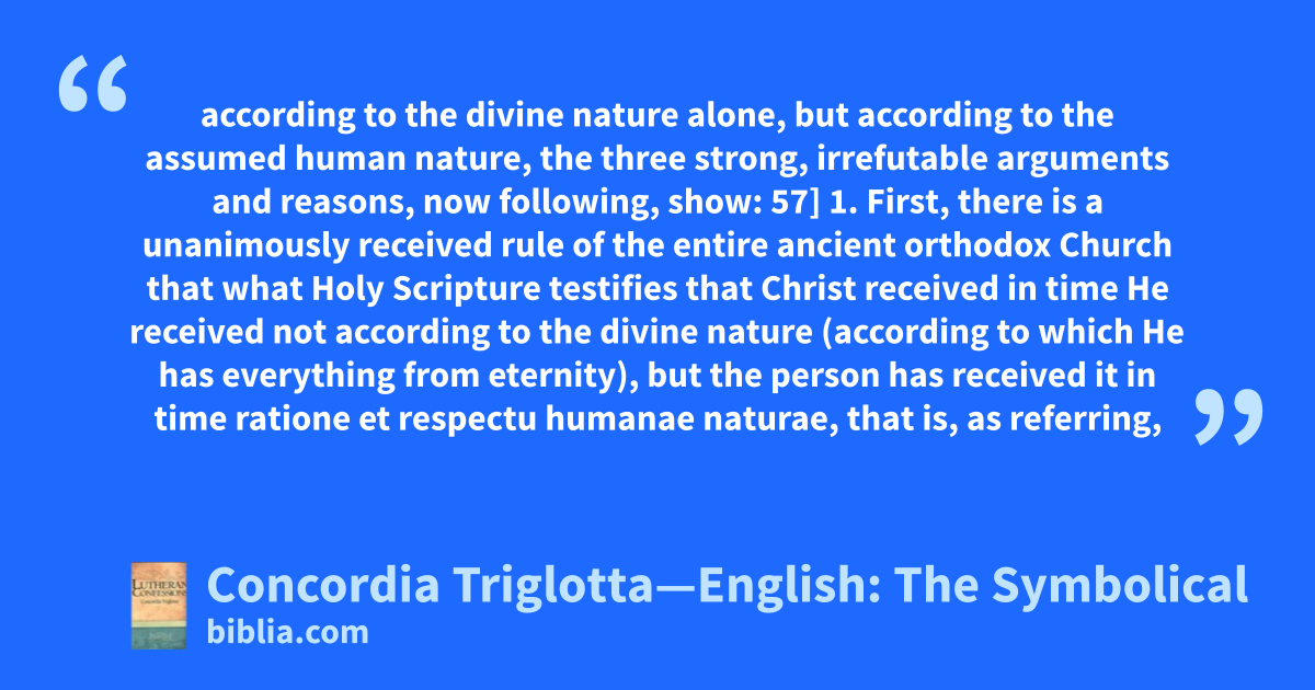 according to the divine nature alone, but according to the assumed human nature, the three strong, irrefutable arguments and reasons, now following, show: 57] 1. First, there is a unanimously received rule of the entire ancient orthodox Church that what Holy Scripture testifies that Christ received in time He received not according to the divine nature (according to which He has everything from eternity), but the person has received it in time ratione et respectu humanae naturae, that is, as referring,