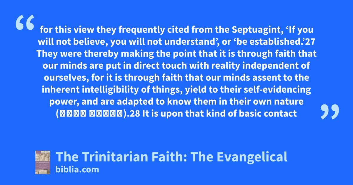 for this view they frequently cited from the Septuagint, ‘If you will not believe, you will not understand’, or ‘be established.’27 They were thereby making the point that it is through faith that our minds are put in direct touch with reality independent of ourselves, for it is through faith that our minds assent to the inherent intelligibility of things, yield to their self-evidencing power, and are adapted to know them in their own nature (κατὰ φύσιν).28 It is upon that kind of basic contact