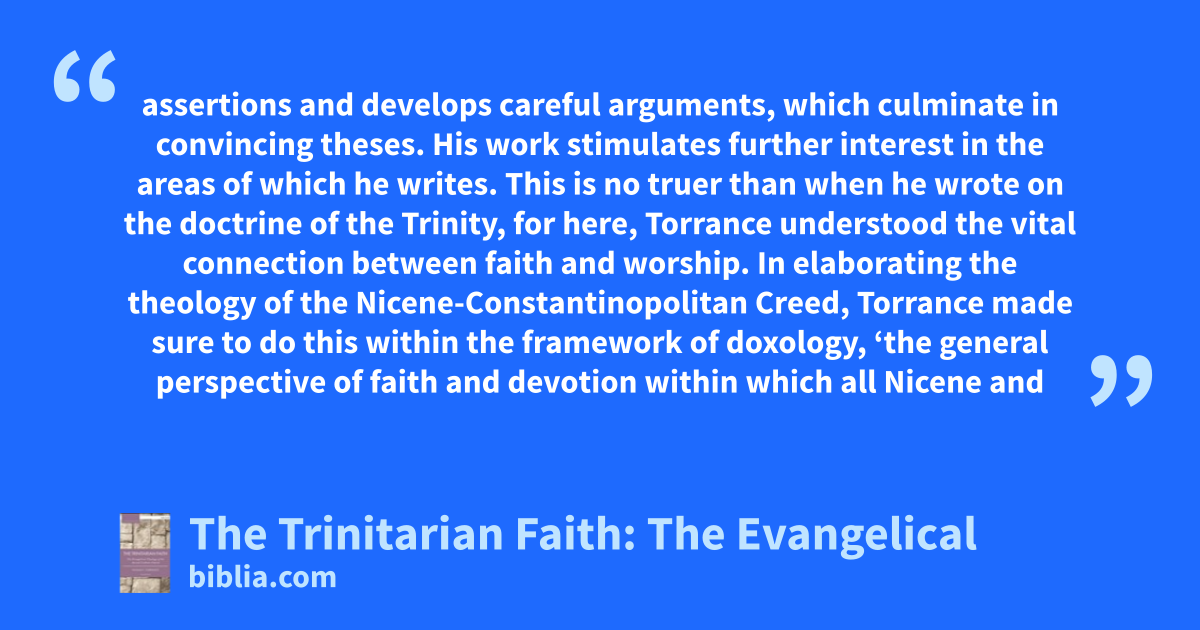 assertions and develops careful arguments, which culminate in convincing theses. His work stimulates further interest in the areas of which he writes. This is no truer than when he wrote on the doctrine of the Trinity, for here, Torrance understood the vital connection between faith and worship. In elaborating the theology of the Nicene-Constantinopolitan Creed, Torrance made sure to do this within the framework of doxology, ‘the general perspective of faith and devotion within which all Nicene and