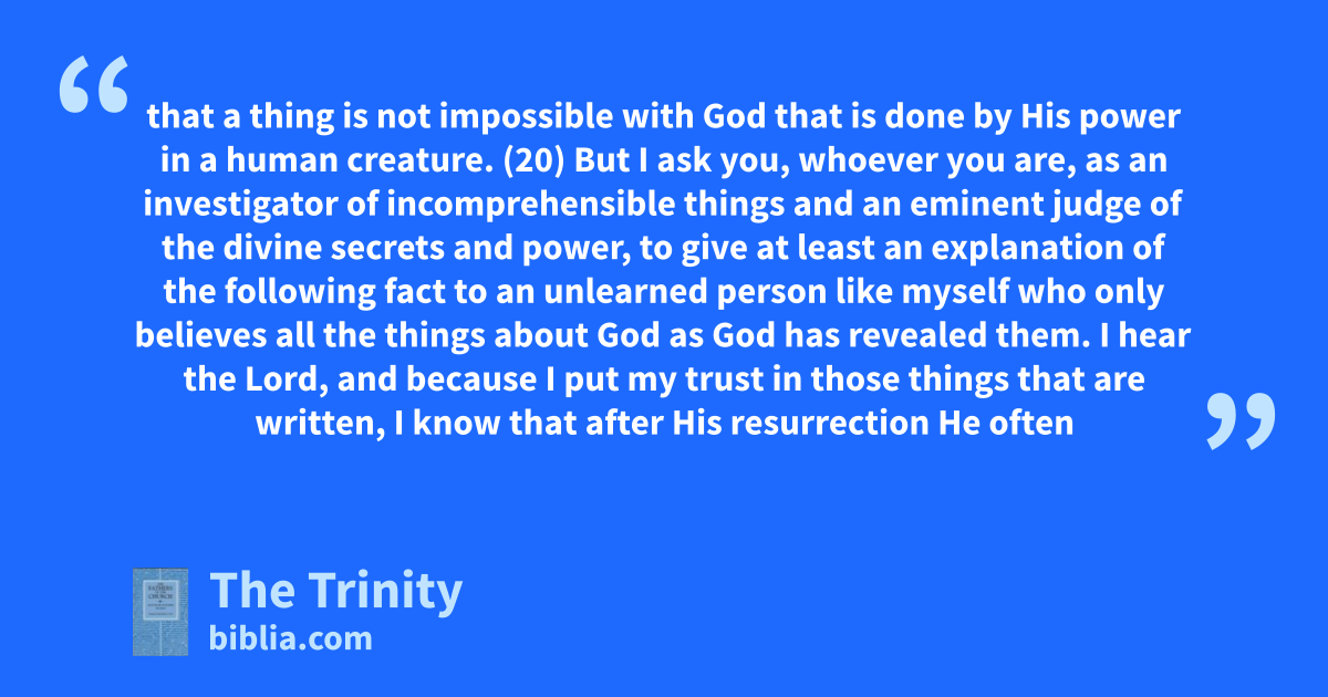 that a thing is not impossible with God that is done by His power in a human creature. (20) But I ask you, whoever you are, as an investigator of incomprehensible things and an eminent judge of the divine secrets and power, to give at least an explanation of the following fact to an unlearned person like myself who only believes all the things about God as God has revealed them. I hear the Lord, and because I put my trust in those things that are written, I know that after His resurrection He often