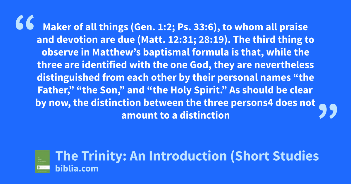 Maker of all things (Gen. 1:2; Ps. 33:6), to whom all praise and devotion are due (Matt. 12:31; 28:19). The third thing to observe in Matthew’s baptismal formula is that, while the three are identified with the one God, they are nevertheless distinguished from each other by their personal names “the Father,” “the Son,” and “the Holy Spirit.” As should be clear by now, the distinction between the three persons4 does not amount to a distinction