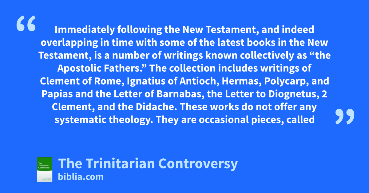 Immediately following the New Testament, and indeed overlapping in time with some of the latest books in the New Testament, is a number of writings known collectively as “the Apostolic Fathers.” The collection includes writings of Clement of Rome, Ignatius of Antioch, Hermas, Polycarp, and Papias and the Letter of Barnabas, the Letter to Diognetus, 2 Clement, and the Didache. These works do not offer any systematic theology. They are occasional pieces, called