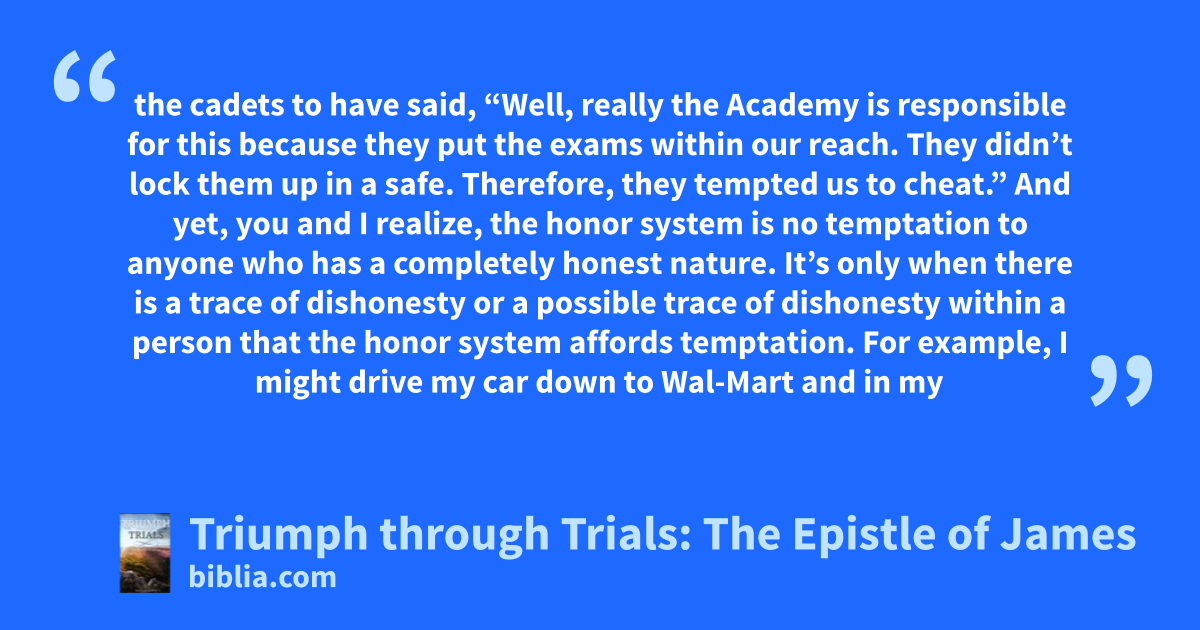 the cadets to have said, “Well, really the Academy is responsible for this because they put the exams within our reach. They didn’t lock them up in a safe. Therefore, they tempted us to cheat.” And yet, you and I realize, the honor system is no temptation to anyone who has a completely honest nature. It’s only when there is a trace of dishonesty or a possible trace of dishonesty within a person that the honor system affords temptation. For example, I might drive my car down to Wal-Mart and in my