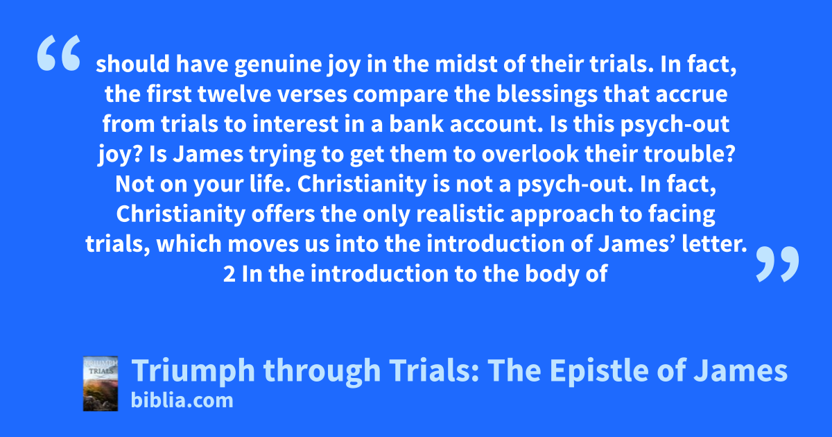 should have genuine joy in the midst of their trials. In fact, the first twelve verses compare the blessings that accrue from trials to interest in a bank account. Is this psych-out joy? Is James trying to get them to overlook their trouble? Not on your life. Christianity is not a psych-out. In fact, Christianity offers the only realistic approach to facing trials, which moves us into the introduction of James’ letter. 2 In the introduction to the body of