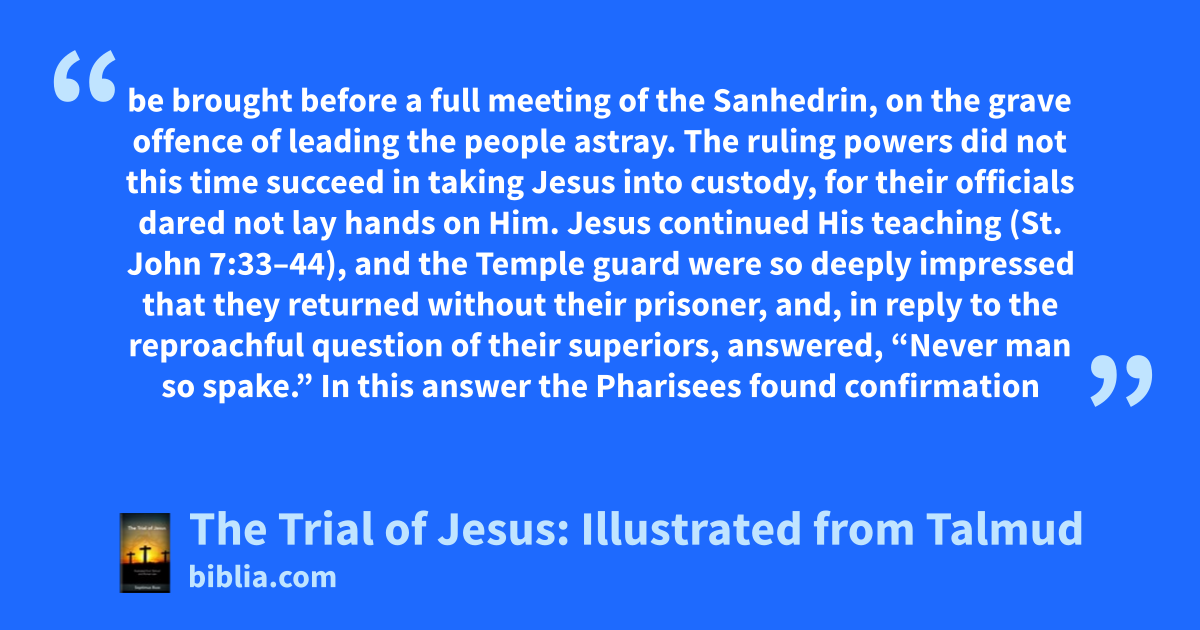 be brought before a full meeting of the Sanhedrin, on the grave offence of leading the people astray. The ruling powers did not this time succeed in taking Jesus into custody, for their officials dared not lay hands on Him. Jesus continued His teaching (St. John 7:33–44), and the Temple guard were so deeply impressed that they returned without their prisoner, and, in reply to the reproachful question of their superiors, answered, “Never man so spake.” In this answer the Pharisees found confirmation