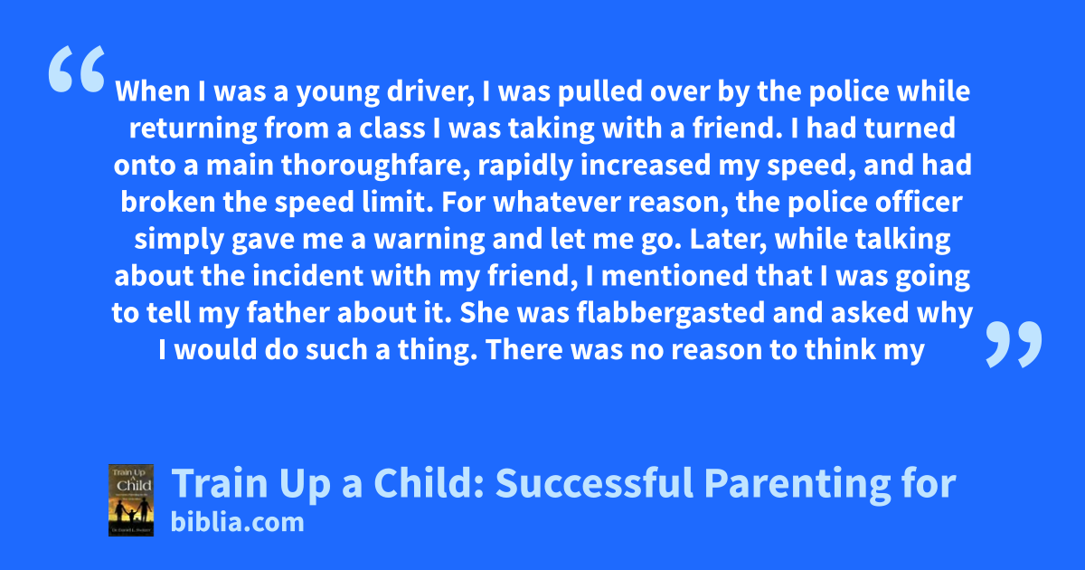 When I was a young driver, I was pulled over by the police while returning from a class I was taking with a friend. I had turned onto a main thoroughfare, rapidly increased my speed, and had broken the speed limit. For whatever reason, the police officer simply gave me a warning and let me go. Later, while talking about the incident with my friend, I mentioned that I was going to tell my father about it. She was flabbergasted and asked why I would do such a thing. There was no reason to think my