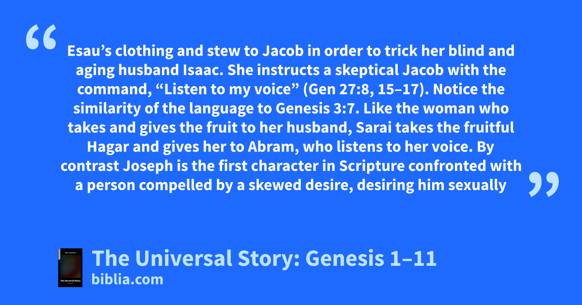 Esau’s clothing and stew to Jacob in order to trick her blind and aging husband Isaac. She instructs a skeptical Jacob with the command, “Listen to my voice” (Gen 27:8, 15–17). Notice the similarity of the language to Genesis 3:7. Like the woman who takes and gives the fruit to her husband, Sarai takes the fruitful Hagar and gives her to Abram, who listens to her voice. By contrast Joseph is the first character in Scripture confronted with a person compelled by a skewed desire, desiring him sexually