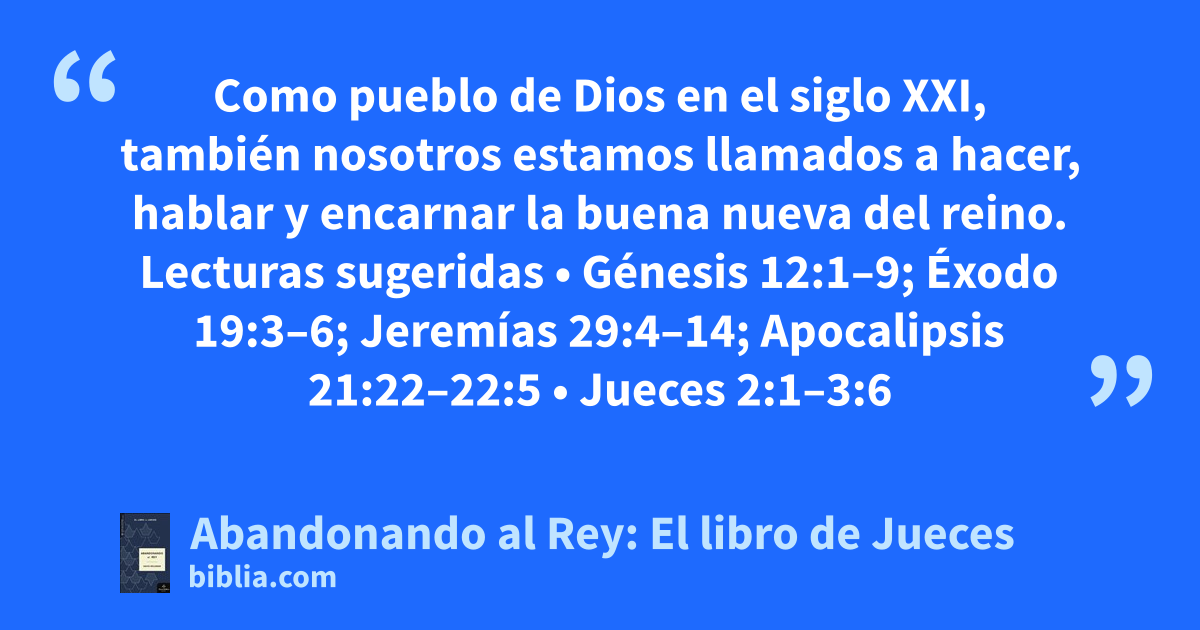 Como pueblo de Dios en el siglo XXI, también nosotros estamos llamados a hacer, hablar y encarnar la buena nueva del reino. Lecturas sugeridas • Génesis 12:1–9; Éxodo 19:3–6; Jeremías 29:4–14; Apocalipsis 21:22–22:5 • Jueces 2:1–3:6