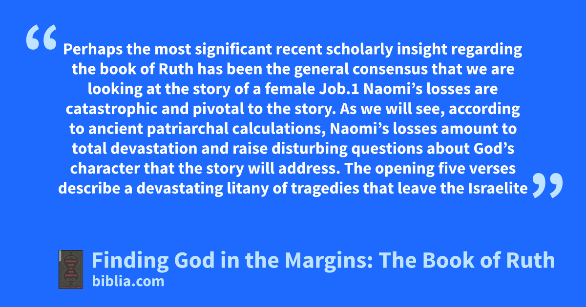 Perhaps the most significant recent scholarly insight regarding the book of Ruth has been the general consensus that we are looking at the story of a female Job.1 Naomi’s losses are catastrophic and pivotal to the story. As we will see, according to ancient patriarchal calculations, Naomi’s losses amount to total devastation and raise disturbing questions about God’s character that the story will address. The opening five verses describe a devastating litany of tragedies that leave the Israelite