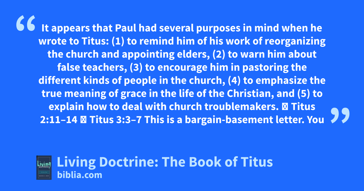 It appears that Paul had several purposes in mind when he wrote to Titus: (1) to remind him of his work of reorganizing the church and appointing elders, (2) to warn him about false teachers, (3) to encourage him in pastoring the different kinds of people in the church, (4) to emphasize the true meaning of grace in the life of the Christian, and (5) to explain how to deal with church troublemakers. ⸋ Titus 2:11–14 ⸋ Titus 3:3–7 This is a bargain-basement letter. You