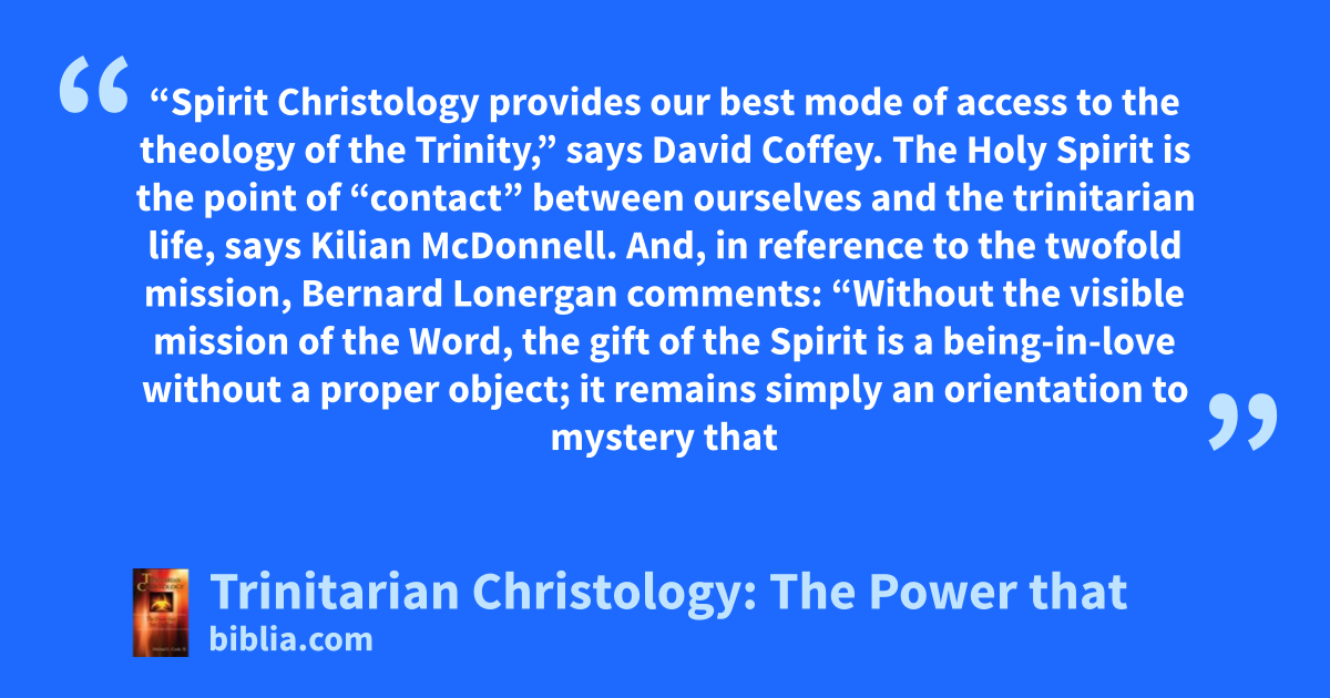 “Spirit Christology provides our best mode of access to the theology of the Trinity,” says David Coffey. The Holy Spirit is the point of “contact” between ourselves and the trinitarian life, says Kilian McDonnell. And, in reference to the twofold mission, Bernard Lonergan comments: “Without the visible mission of the Word, the gift of the Spirit is a being-in-love without a proper object; it remains simply an orientation to mystery that