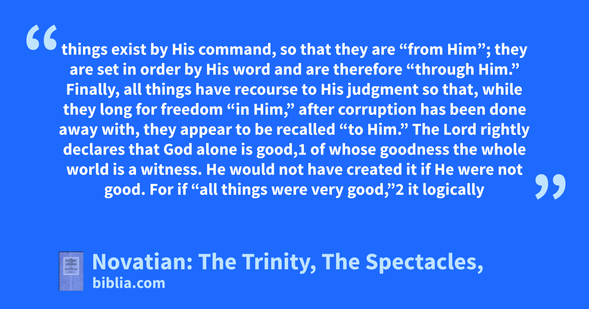 things exist by His command, so that they are “from Him”; they are set in order by His word and are therefore “through Him.” Finally, all things have recourse to His judgment so that, while they long for freedom “in Him,” after corruption has been done away with, they appear to be recalled “to Him.” The Lord rightly declares that God alone is good,1 of whose goodness the whole world is a witness. He would not have created it if He were not good. For if “all things were very good,”2 it logically