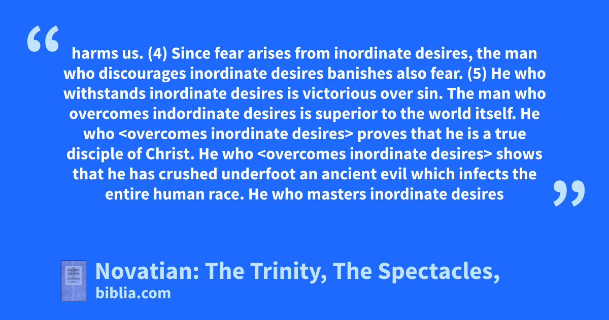 harms us. (4) Since fear arises from inordinate desires, the man who discourages inordinate desires banishes also fear. (5) He who withstands inordinate desires is victorious over sin. The man who overcomes indordinate desires is superior to the world itself. He who proves that he is a true disciple of Christ. He who shows that he has crushed underfoot an ancient evil which infects the entire human race. He who masters inordinate desires