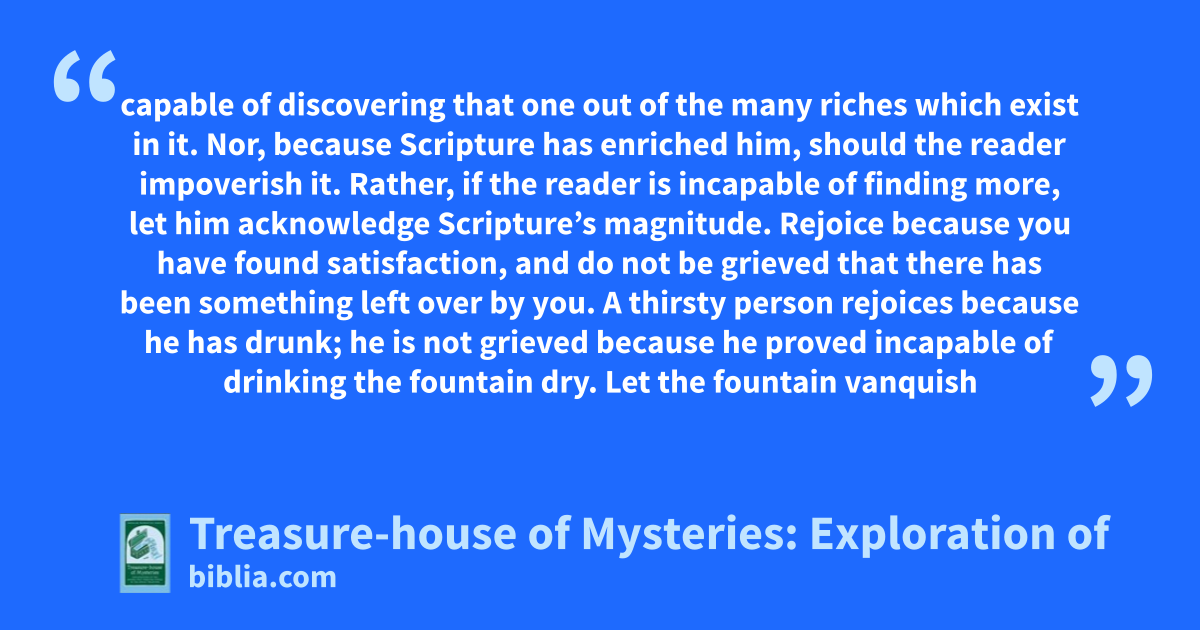 capable of discovering that one out of the many riches which exist in it. Nor, because Scripture has enriched him, should the reader impoverish it. Rather, if the reader is incapable of finding more, let him acknowledge Scripture’s magnitude. Rejoice because you have found satisfaction, and do not be grieved that there has been something left over by you. A thirsty person rejoices because he has drunk; he is not grieved because he proved incapable of drinking the fountain dry. Let the fountain vanquish