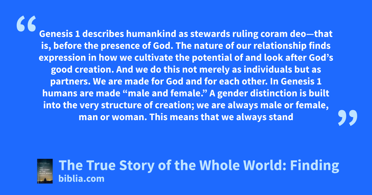 Genesis 1 describes humankind as stewards ruling coram deo—that is, before the presence of God. The nature of our relationship finds expression in how we cultivate the potential of and look after God’s good creation. And we do this not merely as individuals but as partners. We are made for God and for each other. In Genesis 1 humans are made “male and female.” A gender distinction is built into the very structure of creation; we are always male or female, man or woman. This means that we always stand