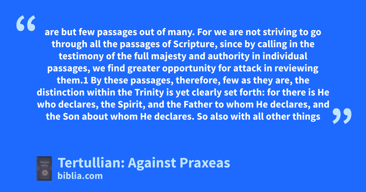 are but few passages out of many. For we are not striving to go through all the passages of Scripture, since by calling in the testimony of the full majesty and authority in individual passages, we find greater opportunity for attack in reviewing them.1 By these passages, therefore, few as they are, the distinction within the Trinity is yet clearly set forth: for there is He who declares, the Spirit, and the Father to whom He declares, and the Son about whom He declares. So also with all other things