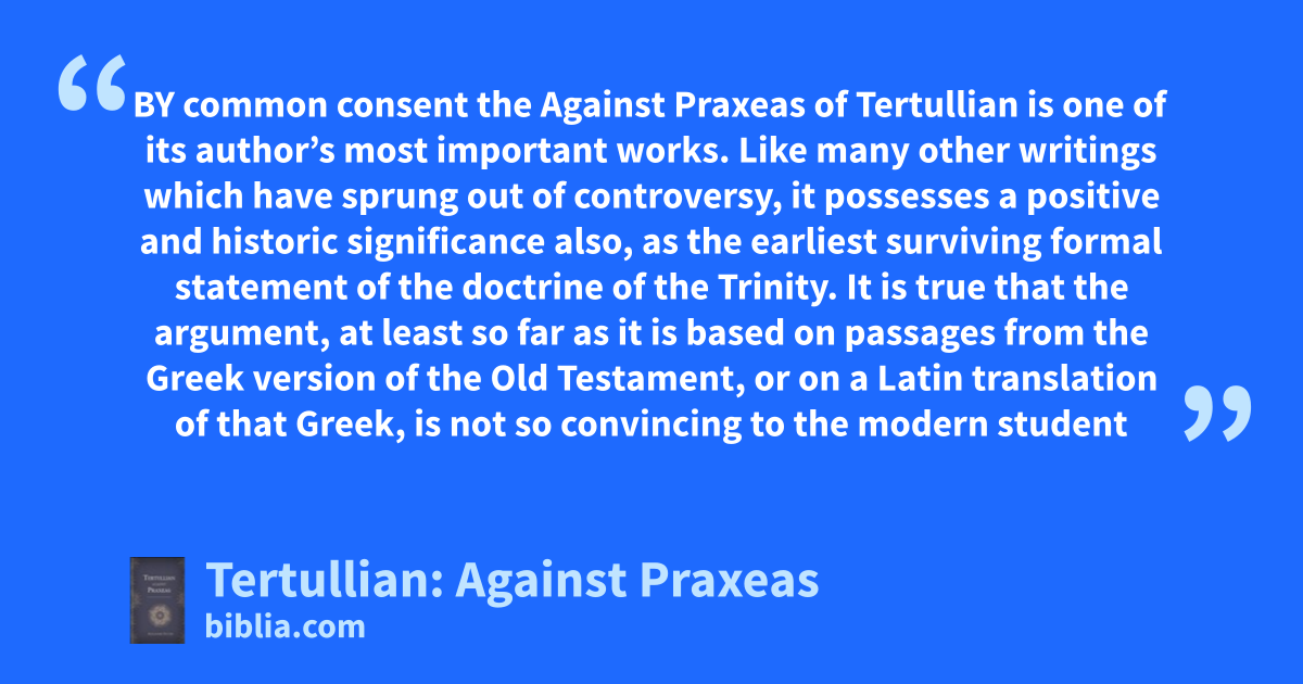 By common consent the Against Praxeas of Tertullian is one of its author’s most important works. It possesses a positive and historic significance as the earliest surviving formal statement of the doctrine of the Trinity. It is true that the argument, at least so far as it is based on passages from the Greek version of the Old Testament, or on a Latin translation of that Greek, is not so...