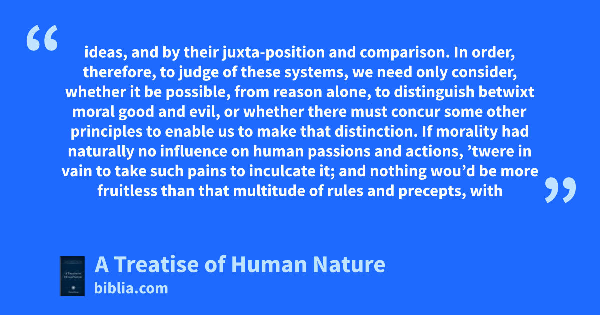 ideas, and by their juxta-position and comparison. In order, therefore, to judge of these systems, we need only consider, whether it be possible, from reason alone, to distinguish betwixt moral good and evil, or whether there must concur some other principles to enable us to make that distinction. If morality had naturally no influence on human passions and actions, ’twere in vain to take such pains to inculcate it; and nothing wou’d be more fruitless than that multitude of rules and precepts, with