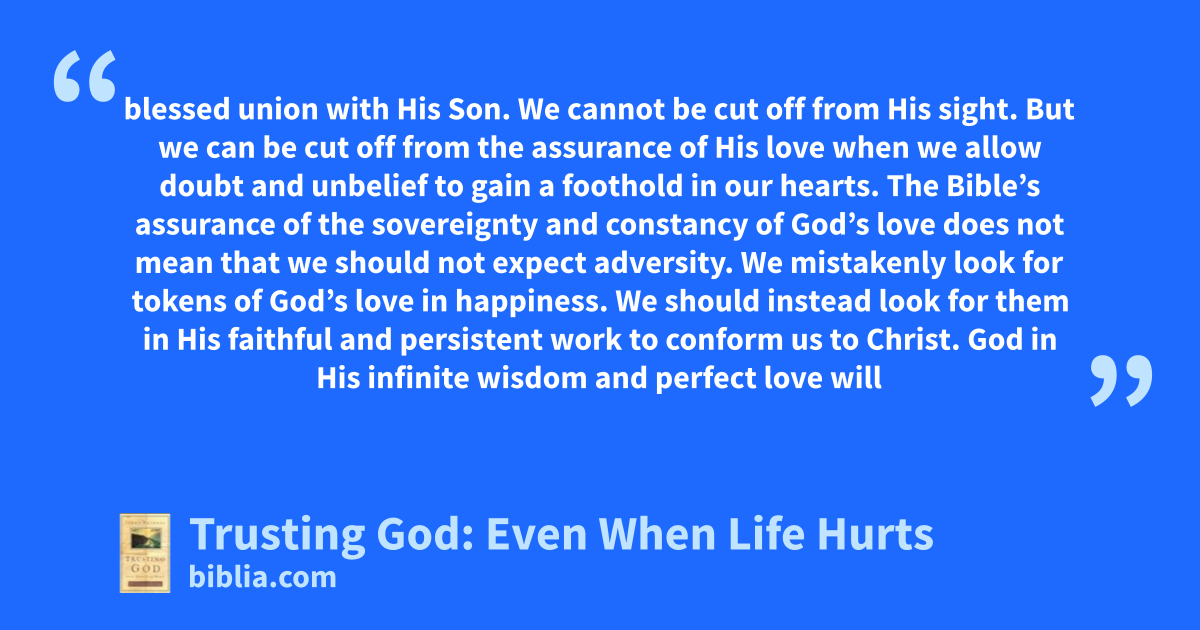 blessed union with His Son. We cannot be cut off from His sight. But we can be cut off from the assurance of His love when we allow doubt and unbelief to gain a foothold in our hearts. The Bible’s assurance of the sovereignty and constancy of God’s love does not mean that we should not expect adversity. We mistakenly look for tokens of God’s love in happiness. We should instead look for them in His faithful and persistent work to conform us to Christ. God in His infinite wisdom and perfect love will