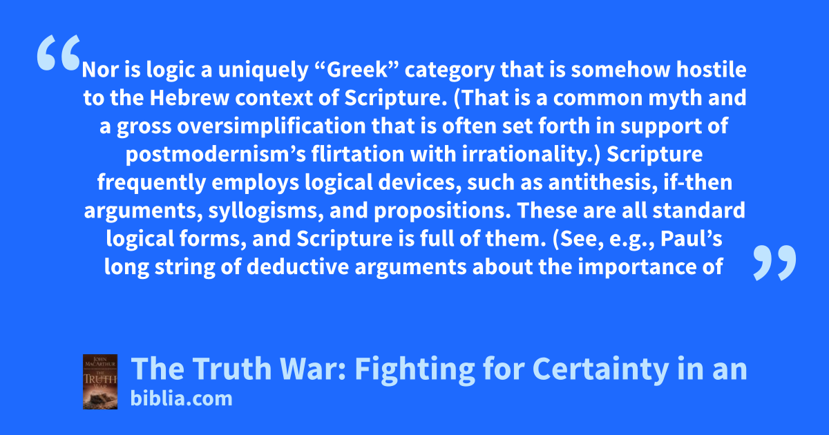 Nor is logic a uniquely “Greek” category that is somehow hostile to the Hebrew context of Scripture. (That is a common myth and a gross oversimplification that is often set forth in support of postmodernism’s flirtation with irrationality.) Scripture frequently employs logical devices, such as antithesis, if-then arguments, syllogisms, and propositions. These are all standard logical forms, and Scripture is full of them. (See, e.g., Paul’s long string of deductive arguments about the importance of