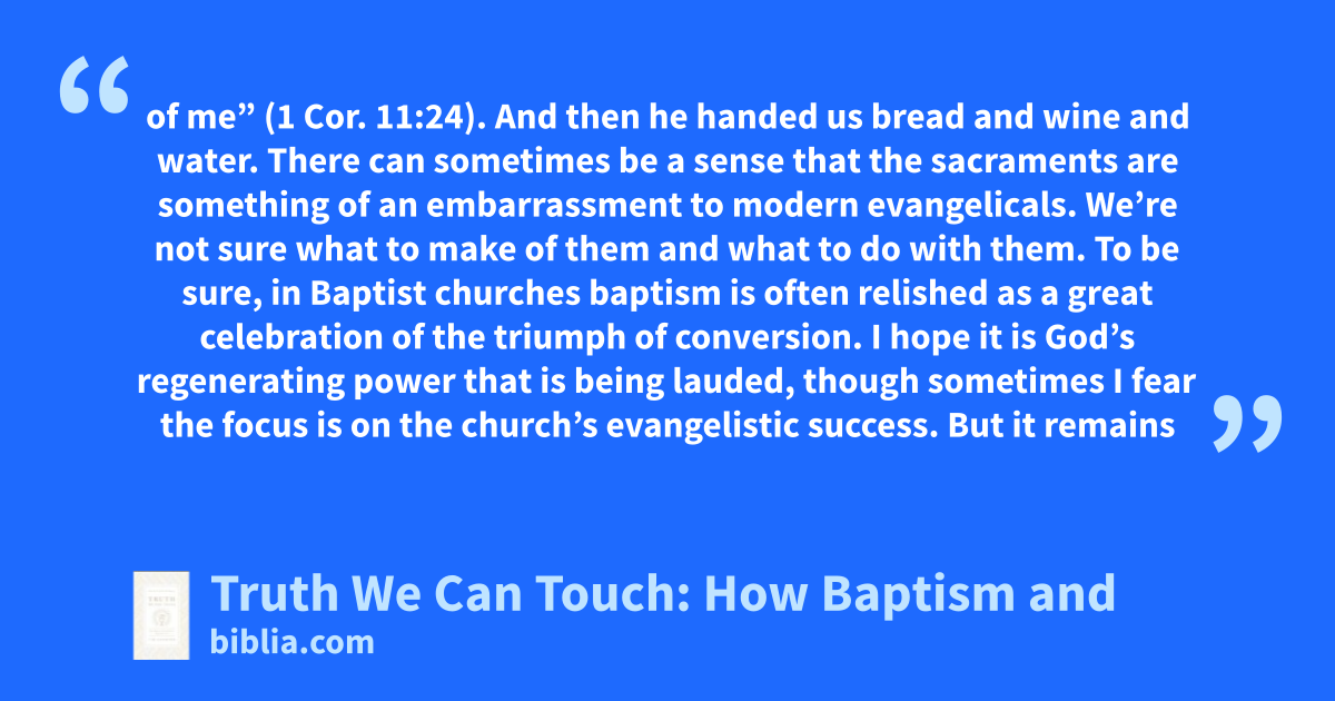 of me” (1 Cor. 11:24). And then he handed us bread and wine and water. There can sometimes be a sense that the sacraments are something of an embarrassment to modern evangelicals. We’re not sure what to make of them and what to do with them. To be sure, in Baptist churches baptism is often relished as a great celebration of the triumph of conversion. I hope it is God’s regenerating power that is being lauded, though sometimes I fear the focus is on the church’s evangelistic success. But it remains