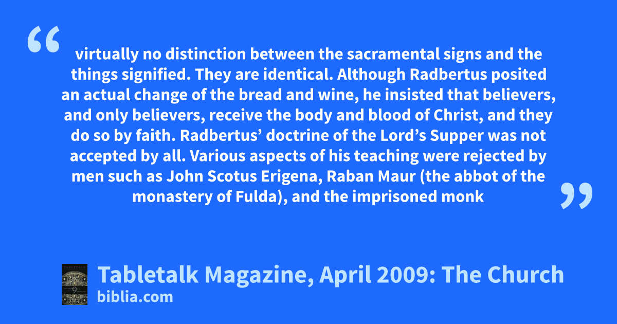 virtually no distinction between the sacramental signs and the things signified. They are identical. Although Radbertus posited an actual change of the bread and wine, he insisted that believers, and only believers, receive the body and blood of Christ, and they do so by faith. Radbertus’ doctrine of the Lord’s Supper was not accepted by all. Various aspects of his teaching were rejected by men such as John Scotus Erigena, Raban Maur (the abbot of the monastery of Fulda), and the imprisoned monk