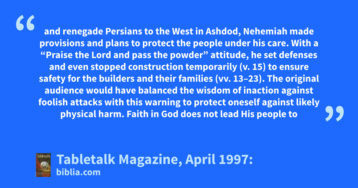 and renegade Persians to the West in Ashdod, Nehemiah made provisions and plans to protect the people under his care. With a “Praise the Lord and pass the powder” attitude, he set defenses and even stopped construction temporarily (v. 15) to ensure safety for the builders and their families (vv. 13–23). The original audience would have balanced the wisdom of inaction against foolish attacks with this warning to protect oneself against likely physical harm. Faith in God does not lead His people to