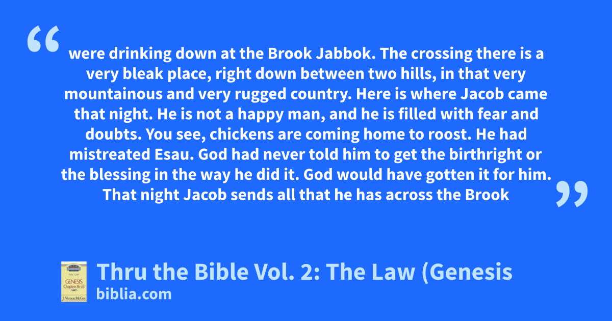were drinking down at the Brook Jabbok. The crossing there is a very bleak place, right down between two hills, in that very mountainous and very rugged country. Here is where Jacob came that night. He is not a happy man, and he is filled with fear and doubts. You see, chickens are coming home to roost. He had mistreated Esau. God had never told him to get the birthright or the blessing in the way he did it. God would have gotten it for him. That night Jacob sends all that he has across the Brook