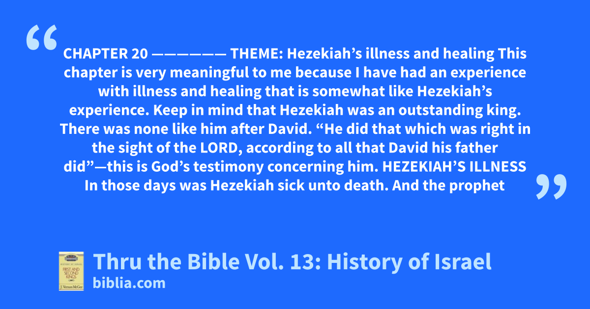 CHAPTER 20 —————— THEME: Hezekiah’s illness and healing This chapter is very meaningful to me because I have had an experience with illness and healing that is somewhat like Hezekiah’s experience. Keep in mind that Hezekiah was an outstanding king. There was none like him after David. “He did that which was right in the sight of the LORD, according to all that David his father did”—this is God’s testimony concerning him. HEZEKIAH’S ILLNESS In those days was Hezekiah sick unto death. And the prophet