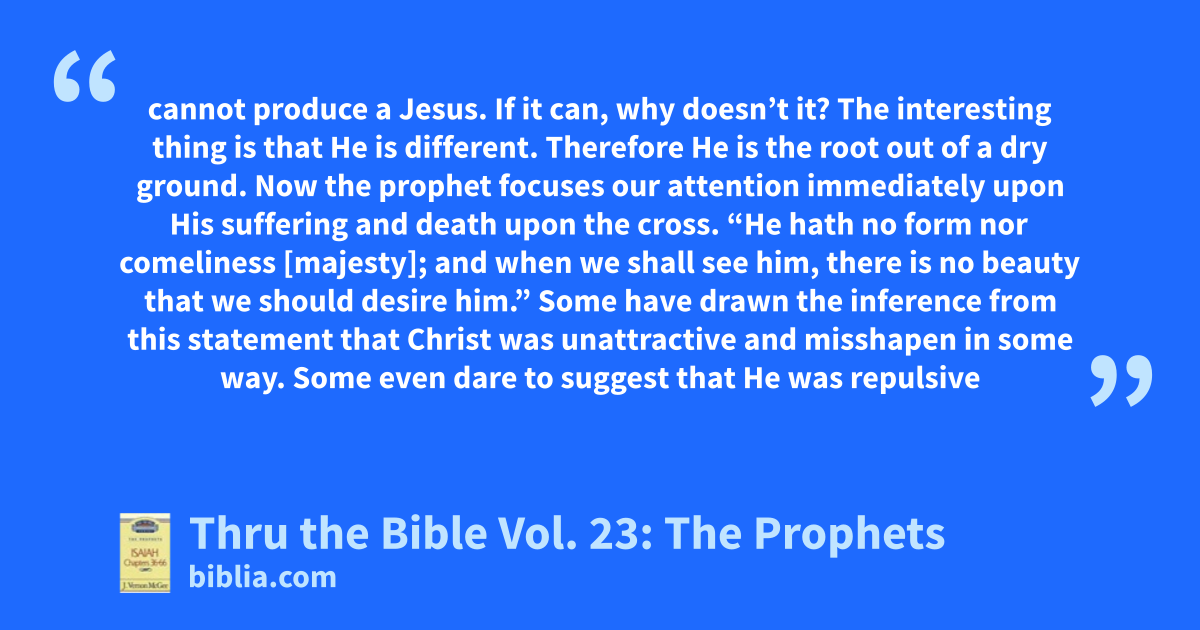 cannot produce a Jesus. If it can, why doesn’t it? The interesting thing is that He is different. Therefore He is the root out of a dry ground. Now the prophet focuses our attention immediately upon His suffering and death upon the cross. “He hath no form nor comeliness [majesty]; and when we shall see him, there is no beauty that we should desire him.” Some have drawn the inference from this statement that Christ was unattractive and misshapen in some way. Some even dare to suggest that He was repulsive
