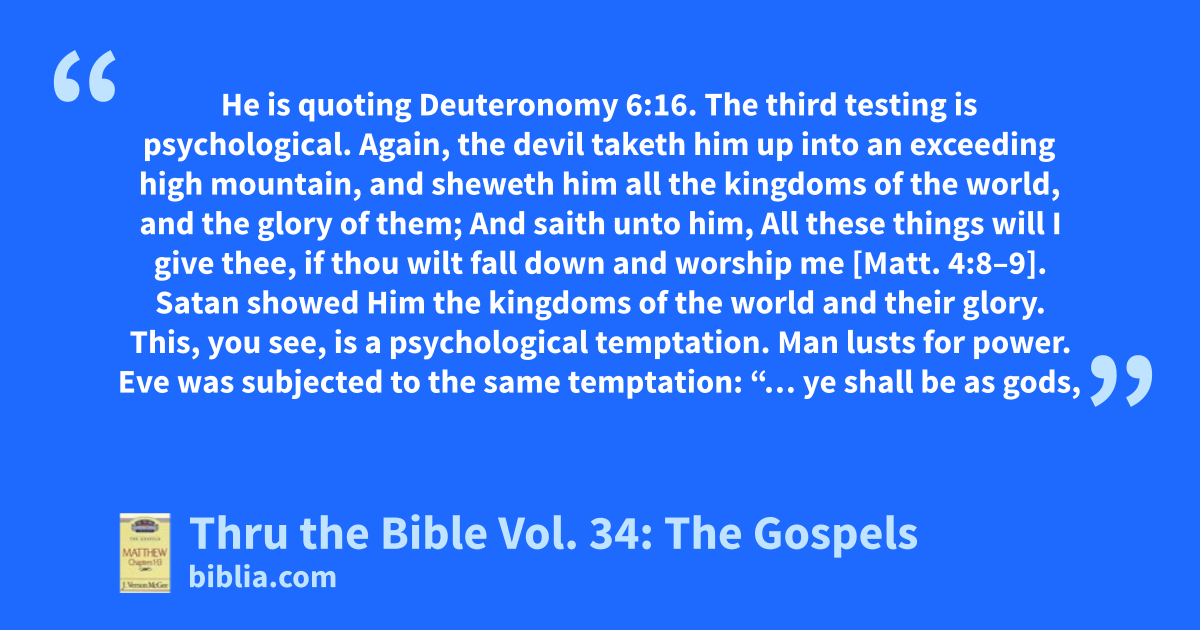 He is quoting Deuteronomy 6:16. The third testing is psychological. Again, the devil taketh him up into an exceeding high mountain, and sheweth him all the kingdoms of the world, and the glory of them; And saith unto him, All these things will I give thee, if thou wilt fall down and worship me [Matt. 4:8–9]. Satan showed Him the kingdoms of the world and their glory. This, you see, is a psychological temptation. Man lusts for power. Eve was subjected to the same temptation: “… ye shall be as gods,