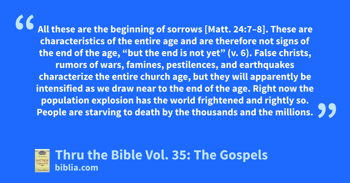 All these are the beginning of sorrows [Matt. 24:7–8]. These are characteristics of the entire age and are therefore not signs of the end of the age, “but the end is not yet” (v. 6). False christs, rumors of wars, famines, pestilences, and earthquakes characterize the entire church age, but they will apparently be intensified as we draw near to the end of the age. Right now the population explosion has the world frightened and rightly so. People are starving to death by the thousands and the millions.