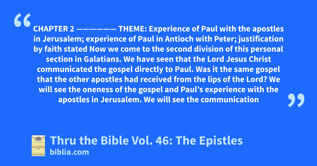 CHAPTER 2 —————— THEME: Experience of Paul with the apostles in Jerusalem; experience of Paul in Antioch with Peter; justification by faith stated Now we come to the second division of this personal section in Galatians. We have seen that the Lord Jesus Christ communicated the gospel directly to Paul. Was it the same gospel that the other apostles had received from the lips of the Lord? We will see the oneness of the gospel and Paul’s experience with the apostles in Jerusalem. We will see the communication
