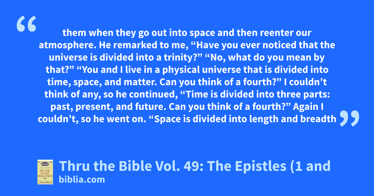 them when they go out into space and then reenter our atmosphere. He remarked to me, “Have you ever noticed that the universe is divided into a trinity?” “No, what do you mean by that?” “You and I live in a physical universe that is divided into time, space, and matter. Can you think of a fourth?” I couldn’t think of any, so he continued, “Time is divided into three parts: past, present, and future. Can you think of a fourth?” Again I couldn’t, so he went on. “Space is divided into length and breadth