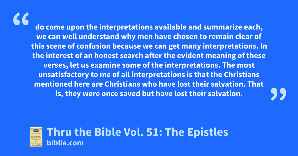 do come upon the interpretations available and summarize each, we can well understand why men have chosen to remain clear of this scene of confusion because we can get many interpretations. In the interest of an honest search after the evident meaning of these verses, let us examine some of the interpretations. The most unsatisfactory to me of all interpretations is that the Christians mentioned here are Christians who have lost their salvation. That is, they were once saved but have lost their salvation.