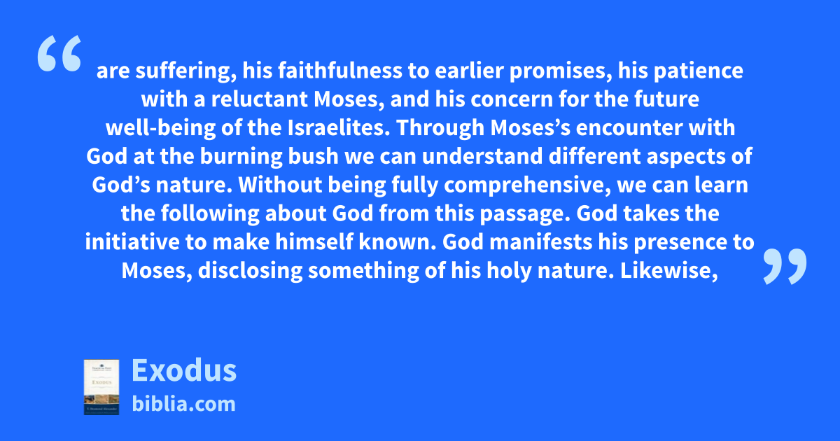 are suffering, his faithfulness to earlier promises, his patience with a reluctant Moses, and his concern for the future well-being of the Israelites. Through Moses’s encounter with God at the burning bush we can understand different aspects of God’s nature. Without being fully comprehensive, we can learn the following about God from this passage. God takes the initiative to make himself known. God manifests his presence to Moses, disclosing something of his holy nature. Likewise,