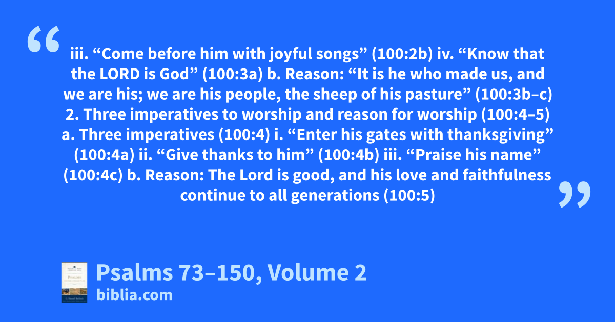 iii. “Come before him with joyful songs” (100:2b) iv. “Know that the LORD is God” (100:3a) b. Reason: “It is he who made us, and we are his; we are his people, the sheep of his pasture” (100:3b–c) 2. Three imperatives to worship and reason for worship (100:4–5) a. Three imperatives (100:4) i. “Enter his gates with thanksgiving” (100:4a) ii. “Give thanks to him” (100:4b) iii. “Praise his name” (100:4c) b. Reason: The Lord is good, and his love and faithfulness continue to all generations (100:5)