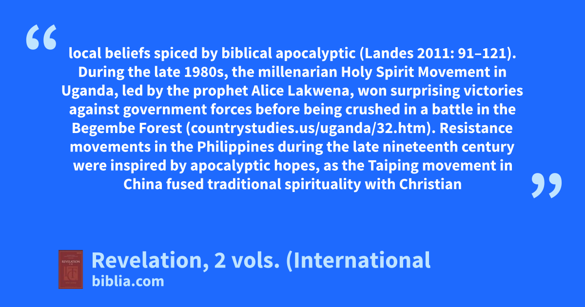 local beliefs spiced by biblical apocalyptic (Landes 2011: 91–121). During the late 1980s, the millenarian Holy Spirit Movement in Uganda, led by the prophet Alice Lakwena, won surprising victories against government forces before being crushed in a battle in the Begembe Forest (countrystudies.us/uganda/32.htm). Resistance movements in the Philippines during the late nineteenth century were inspired by apocalyptic hopes, as the Taiping movement in China fused traditional spirituality with Christian
