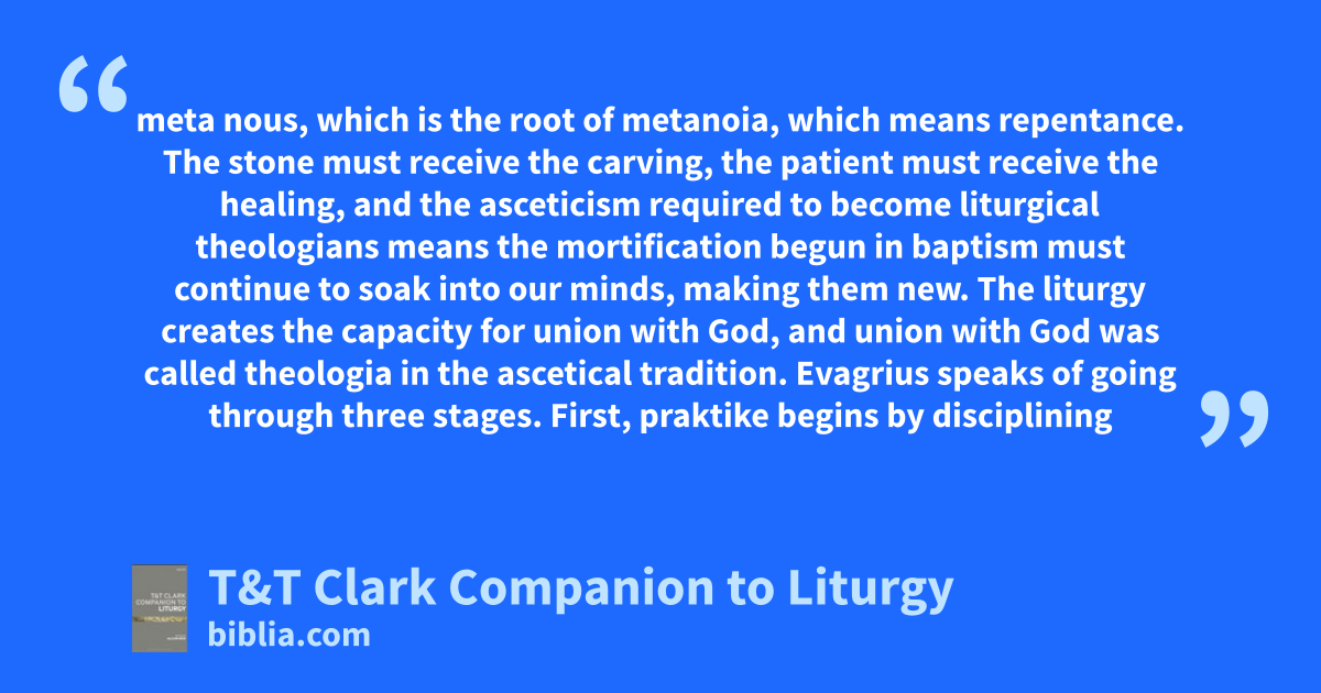 meta nous, which is the root of metanoia, which means repentance. The stone must receive the carving, the patient must receive the healing, and the asceticism required to become liturgical theologians means the mortification begun in baptism must continue to soak into our minds, making them new. The liturgy creates the capacity for union with God, and union with God was called theologia in the ascetical tradition. Evagrius speaks of going through three stages. First, praktike begins by disciplining