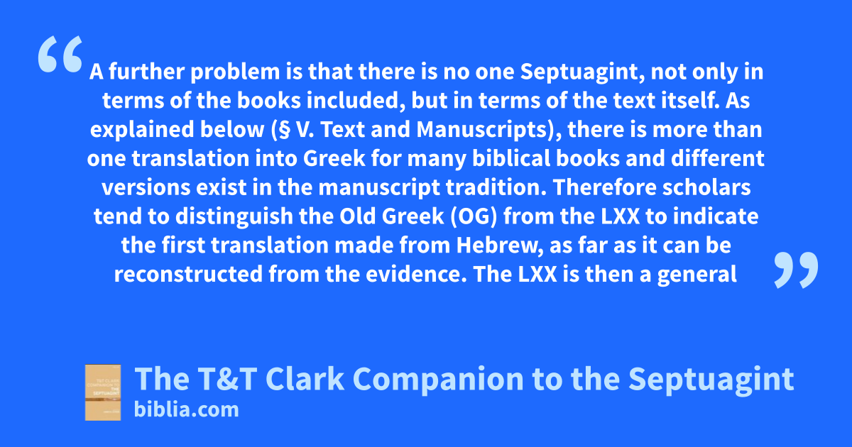 A further problem is that there is no one Septuagint, not only in terms of the books included, but in terms of the text itself. As explained below (§ V. Text and Manuscripts), there is more than one translation into Greek for many biblical books and different versions exist in the manuscript tradition. Therefore scholars tend to distinguish the Old Greek (OG) from the LXX to indicate the first translation made from Hebrew, as far as it can be reconstructed from the evidence. The LXX is then a general