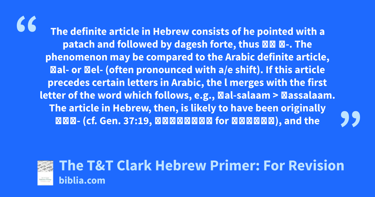 The definite article in Hebrew consists of he pointed with a patach and followed by dagesh forte, thus הַ ּ-. The phenomenon may be compared to the Arabic definite article, ͗al- or ͗el- (often pronounced with a/e shift). If this article precedes certain letters in Arabic, the l merges with the first letter of the word which follows, e.g., ͗al-salaam > ͗assalaam. The article in Hebrew, then, is likely to have been originally הַל- (cf. Gen. 37:19, הַלָּזֶה for הַזֶּה), and the