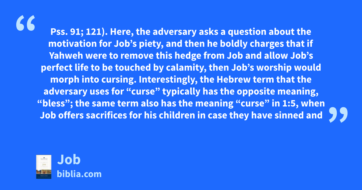 Pss. 91; 121). Here, the adversary asks a question about the motivation for Job’s piety, and then he boldly charges that if Yahweh were to remove this hedge from Job and allow Job’s perfect life to be touched by calamity, then Job’s worship would morph into cursing. Interestingly, the Hebrew term that the adversary uses for “curse” typically has the opposite meaning, “bless”; the same term also has the meaning “curse” in 1:5, when Job offers sacrifices for his children in case they have sinned and