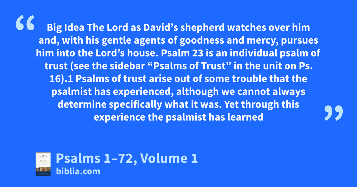 Big Idea The Lord as David’s shepherd watches over him and, with his gentle agents of goodness and mercy, pursues him into the Lord’s house. Psalm 23 is an individual psalm of trust (see the sidebar “Psalms of Trust” in the unit on Ps. 16).1 Psalms of trust arise out of some trouble that the psalmist has experienced, although we cannot always determine specifically what it was. Yet through this experience the psalmist has learned