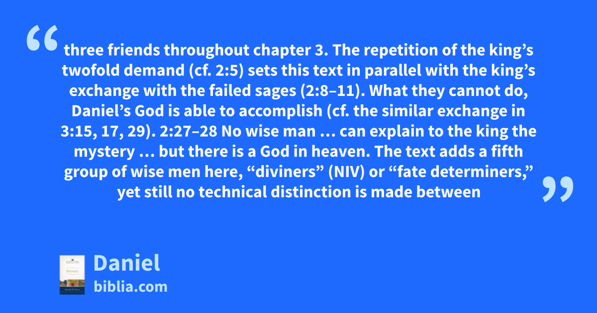 three friends throughout chapter 3. The repetition of the king’s twofold demand (cf. 2:5) sets this text in parallel with the king’s exchange with the failed sages (2:8–11). What they cannot do, Daniel’s God is able to accomplish (cf. the similar exchange in 3:15, 17, 29). 2:27–28 No wise man … can explain to the king the mystery … but there is a God in heaven. The text adds a fifth group of wise men here, “diviners” (NIV) or “fate determiners,” yet still no technical distinction is made between
