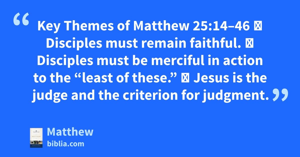 Key Themes of Matthew 25:14–46 ▪ Disciples must remain faithful. ▪ Disciples must be merciful in action to the “least of these.” ▪ Jesus is the judge and the criterion for judgment.